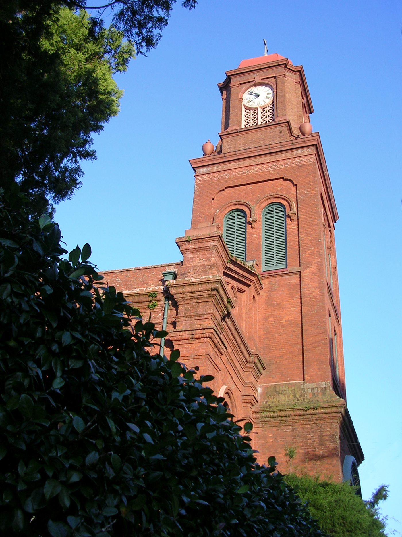 The red-brick church rises on Dauphine Street, designed in the basilica plan. The earlier frame building becomes the parish school.